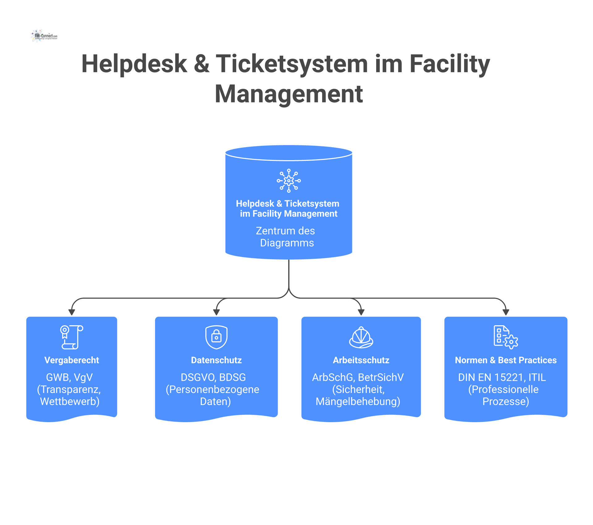 Darüber hinaus orientiert sich das Konzept an einschlägigen Normen und Best Practices im Facility Management. Die europäische Norm DIN EN 15221 definiert z.B. Begrifflichkeiten und Leitlinien für das Facility Management, welche auch für das technische Gebäudemanagement und die Gestaltung von Serviceprozessen relevant sind. Ferner sollte das Helpdesk- und Ticketingverfahren an das ITIL-Rahmenwerk (Information Technology Infrastructure Library) für Service Management angelehnt sein. ITIL empfiehlt bewährte Prozesse für Incident Management, Service Request Fulfillment und kontinuierliche Verbesserung, die hier angewandt werden können. Die Beachtung dieser Standards gewährleistet eine professionelle, standardisierte Abwicklung der Helpdesk-Dienstleistungen.