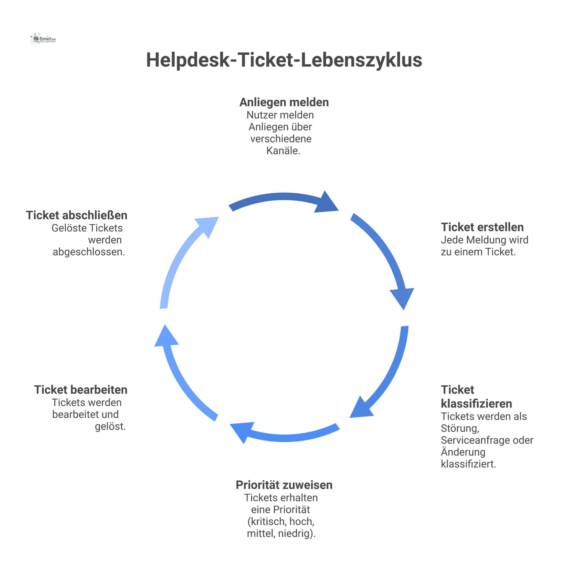 Prozessdarstellungen: Grafische und/oder textuelle Darstellung der Abläufe für Störungsmeldung, Ticketbearbeitung, Eskalation und Abschluss. Hierzu gehören z.B. Flowcharts oder Ablaufdiagramme, welche Rollen (Helpdesk-Mitarbeiter, Techniker, Management) und Schritte (Meldungsannahme, Fehleranalyse, Weiterleitung, Rückmeldung, Abschluss) im Prozess veranschaulichen.