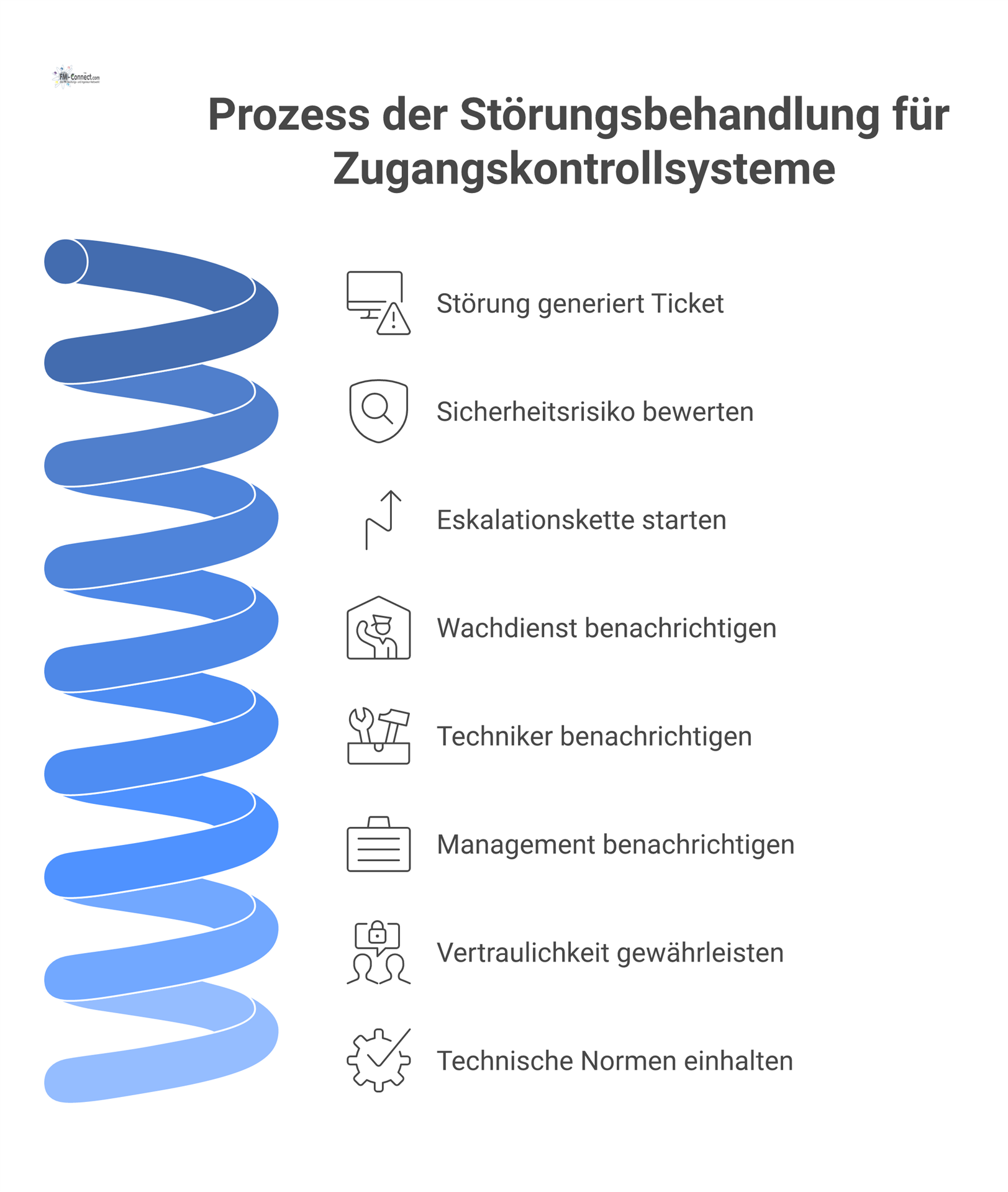 Technische Störungen im Bereich der Zugangskontroll- und Sicherheitssysteme erfordern besondere Aufmerksamkeit, da sie direkt die Sicherung des Gebäudes betreffen. Das Helpdesk-System muss in der Lage sein, Ereignisse wie z.B. den Ausfall eines elektronischen Türschlosses, eine Störung bei einem Kartenlesegerät, Fehlfunktionen eines biometrischen Zugangssystems oder Alarmmeldungen über unbefugte Zutrittsversuche als Tickets aufzunehmen.