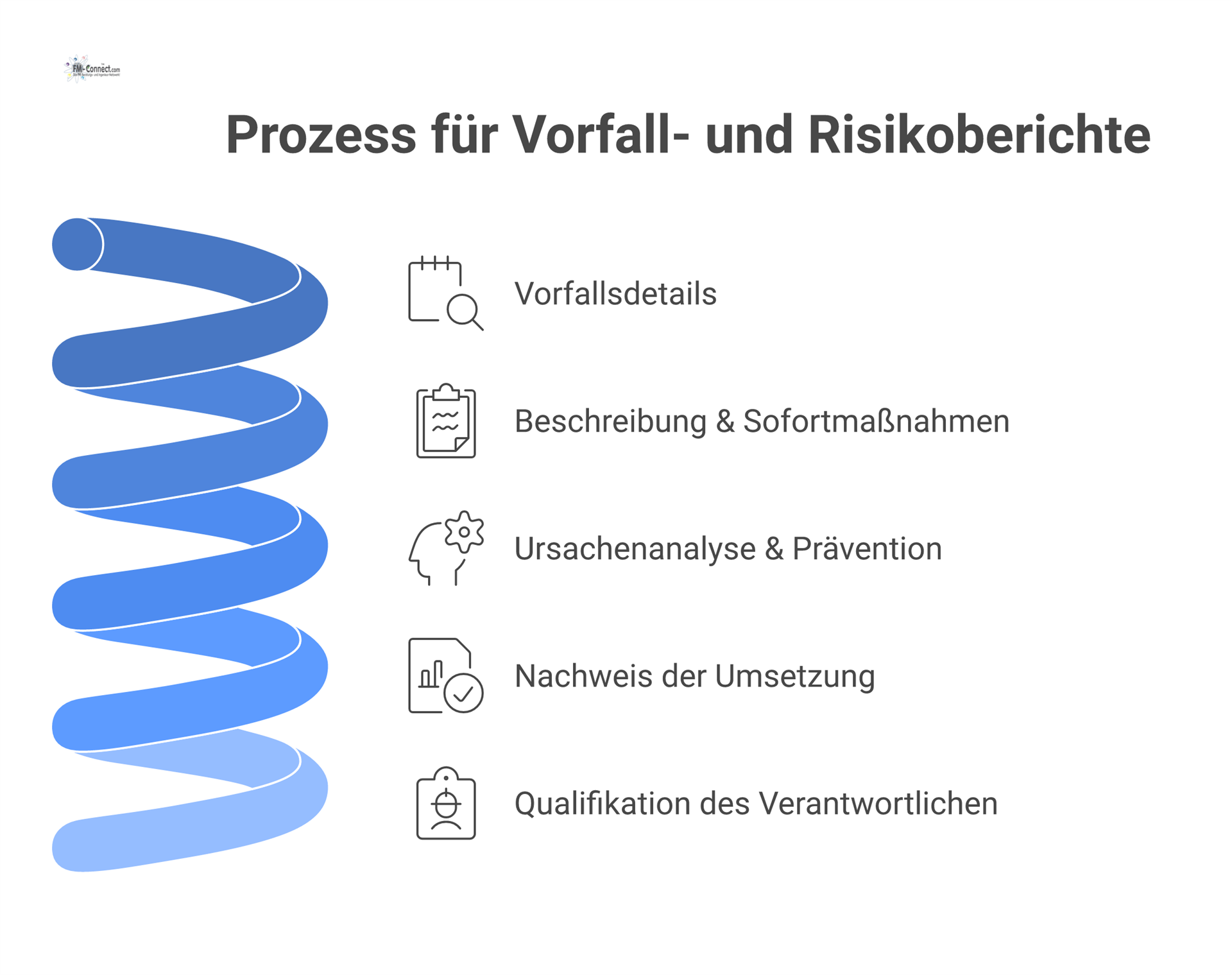 Vorfallsdetails: Konkrete Angaben zum Vorfall wie Art des Ereignisses (z.B. technischer Defekt, Unfall, Sicherheitsverstoß), Datum und Uhrzeit des Auftretens, Ort bzw. betroffener Gebäudebereich und die involvierte Anlage oder das System. Diese Basisdaten ermöglichen eine eindeutige Zuordnung des Ereignisses.