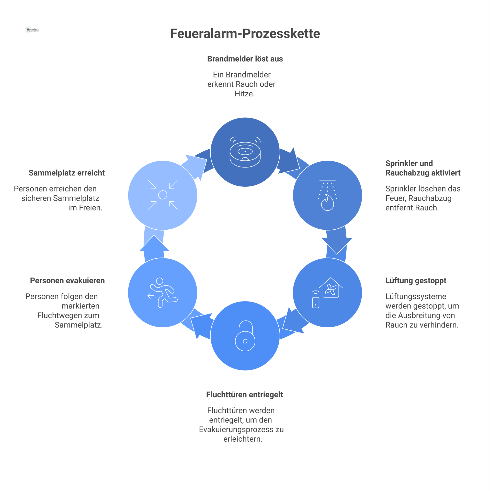 Integration mit Gebäudeleittechnik und Zutrittskontrolle: Moderne Industriegebäude verfügen in der Regel über Gebäudeleittechnik (GLT/BMS) und elektronische Zutrittskontrollsysteme. Der Brandschutz- und Evakuierungsplan muss darlegen, wie diese technischen Systeme im Ereignisfall zusammenspielen. Bei Feueralarm sind automatische Steuerungen vorzusehen, die z. B. Lüftungs- und Klimaanlagen abschalten, Rauchabzugsanlagen aktivieren und Brandschutztüren schließen, um eine Rauchausbreitung zu verhindern. Gleichzeitig müssen alle Türen entlang der definierten Flucht- und Rettungswege automatisch entriegelt werden, damit die Evakuierung nicht behindert wird. Hier ist insbesondere auf die Schnittstelle zum Zutrittskontrollsystem zu achten: Elektrisch verriegelte Türen im Fluchtweg müssen im Brandfall in einen sicheren Zustand wechseln (stromlos geöffnet, fail-safe). Zugleich soll verhindert werden, dass Unbefugte die Notsituation ausnutzen – dies wird etwa erreicht, indem Außentüren zwar das Verlassen ermöglichen, aber ein Zugang von außen weiterhin kontrolliert bleibt (z. B. durch Einsetzen von Panikbeschlägen mit Einwegfunktion). Der Plan sollte auch berücksichtigen, dass relevante Alarme und Störmeldungen an das Gebäudemanagementsystem übertragen werden, sodass das Betriebspersonal in der Leitwarte alle notwendigen Informationen (Brandort, ausgelöste Melder, Technikzustände) auf einen Blick erhält. Nur durch eine integrale Betrachtung aller technischen Anlagen kann im Ernstfall ein sicherer und reibungsloser Evakuierungsablauf gewährleistet werden.