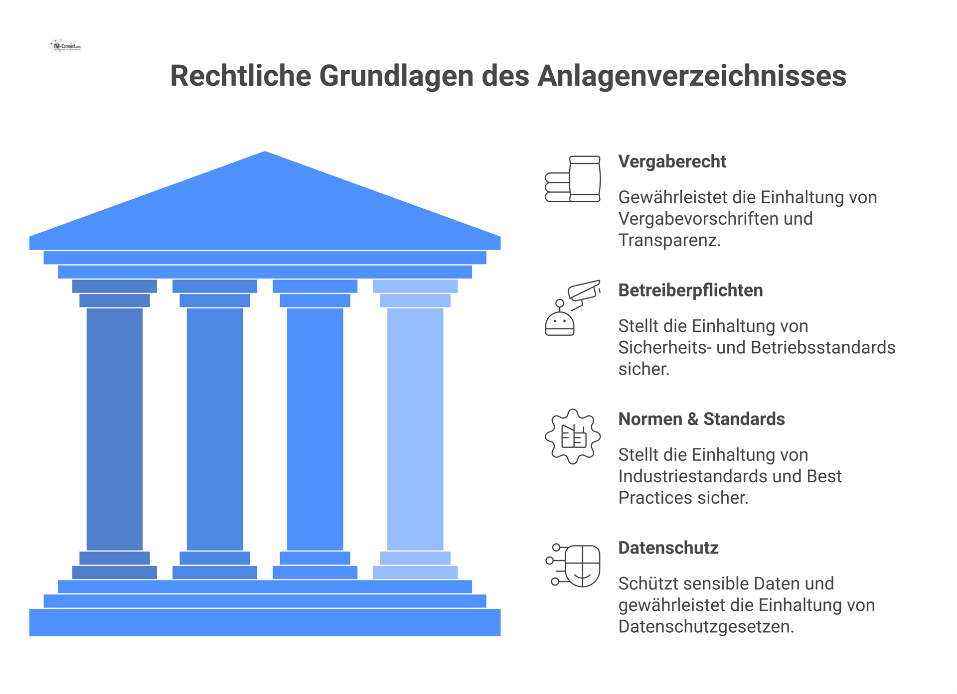 Zusammenfassend schafft das Anlagenverzeichnis also die Voraussetzung, sowohl vergaberechtliche Anforderungen (Transparenz, Gleichbehandlung) als auch betrieblich-rechtliche Pflichten (Sicherheit, Arbeitsschutz, Datenschutz) im Facility-Management-Vertrag umzusetzen. Es verbindet die vertragliche Leistungspflicht des Dienstleisters mit den gesetzlichen Rahmenbedingungen, die für den Betrieb der jeweiligen Anlage gelten.