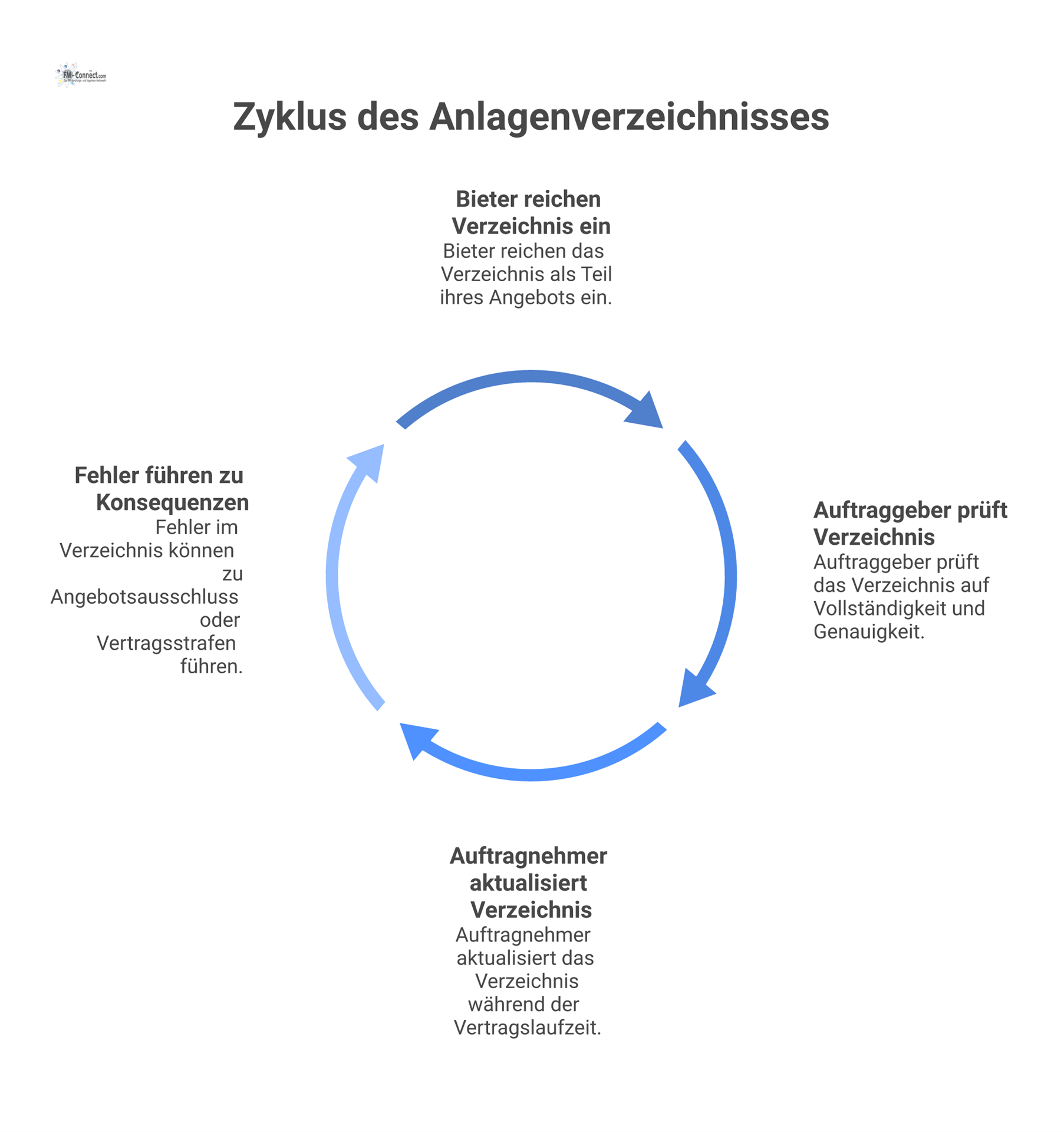 Zusammengefasst verlangt der Ausschreibungsprozess also zunächst die Vorlage eines vollständigen Anlagenverzeichnisses als Angebotsbestandteil, gefolgt von einer Überprüfung durch den Auftraggeber. Nach Vertragsschluss muss dieses Verzeichnis ein „lebendes Dokument“ bleiben, das regelmäßig aktualisiert wird. Die Einhaltung dieser Vorgehensweise ist nicht nur formaler Natur, sondern trägt wesentlich zur Qualität und Rechtssicherheit der FM-Dienstleistung bei.