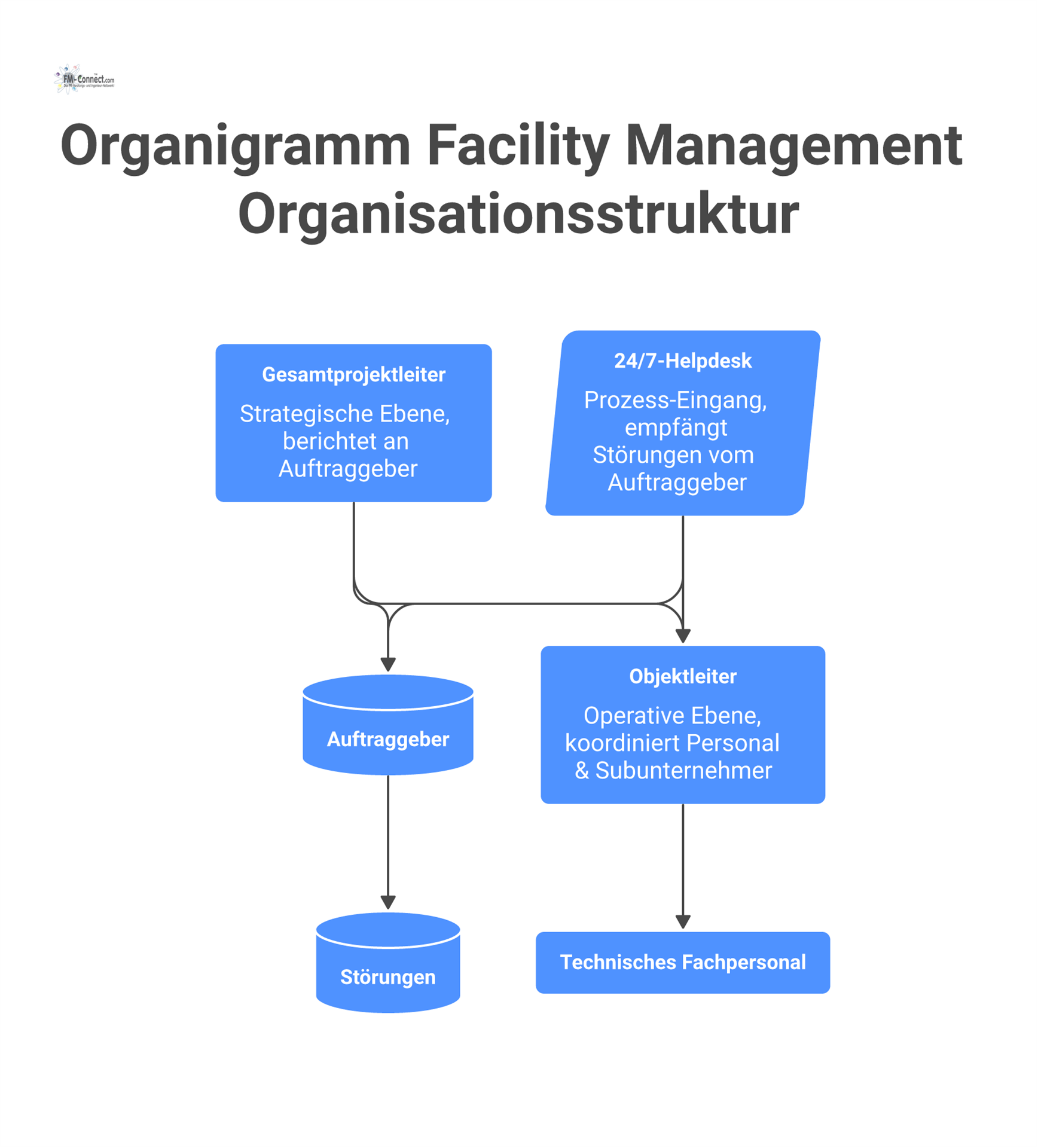 Objektleiter / Objektmanager: Für das konkrete Gebäude wird ein Objektleiter eingesetzt, der die operative Gesamtverantwortung vor Ort trägt. Der Objektleiter koordiniert die täglichen Abläufe, disponiert das technische Personal und die Nachunternehmer, und stellt die Umsetzung der festgelegten Prozesse sicher. Er ist erster Ansprechpartner für den Auftraggeber und die Nutzer des Gebäudes in allen Belangen des technischen Gebäudebetriebs. Zudem obliegt ihm das lokale Berichtswesen (z.B. Monatsberichte, Störungsmeldungen) gegenüber dem Auftraggeber sowie die Durchführung von regelmäßigen Abstimmungsterminen.