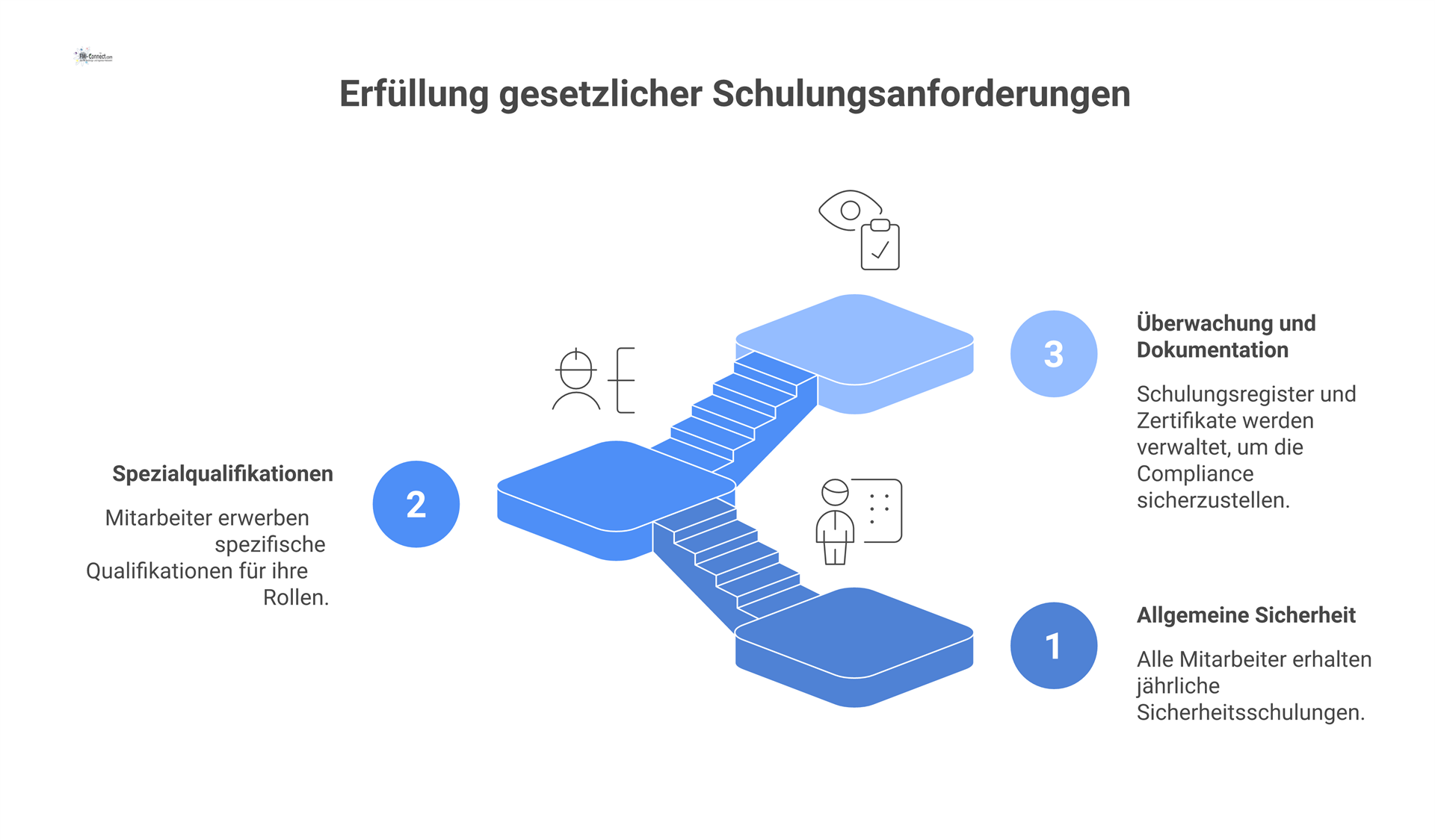 Alle Schulungs- und Unterweisungsmaßnahmen werden unter strikter Beachtung der in Deutschland geltenden gesetzlichen und behördlichen Vorgaben geplant und durchgeführt. Dies umfasst die Einhaltung der Bestimmungen des Arbeitsschutzes und der Unfallverhütung (z.B. Arbeitsschutzgesetz (ArbSchG) und berufsgenossenschaftliche DGUV-Vorschriften), der betrieblichen Sicherheitsauflagen (etwa der Betriebssicherheitsverordnung für den Umgang mit Arbeitsmitteln) sowie relevanter Umweltauflagen und arbeitsrechtlicher Bestimmungen.