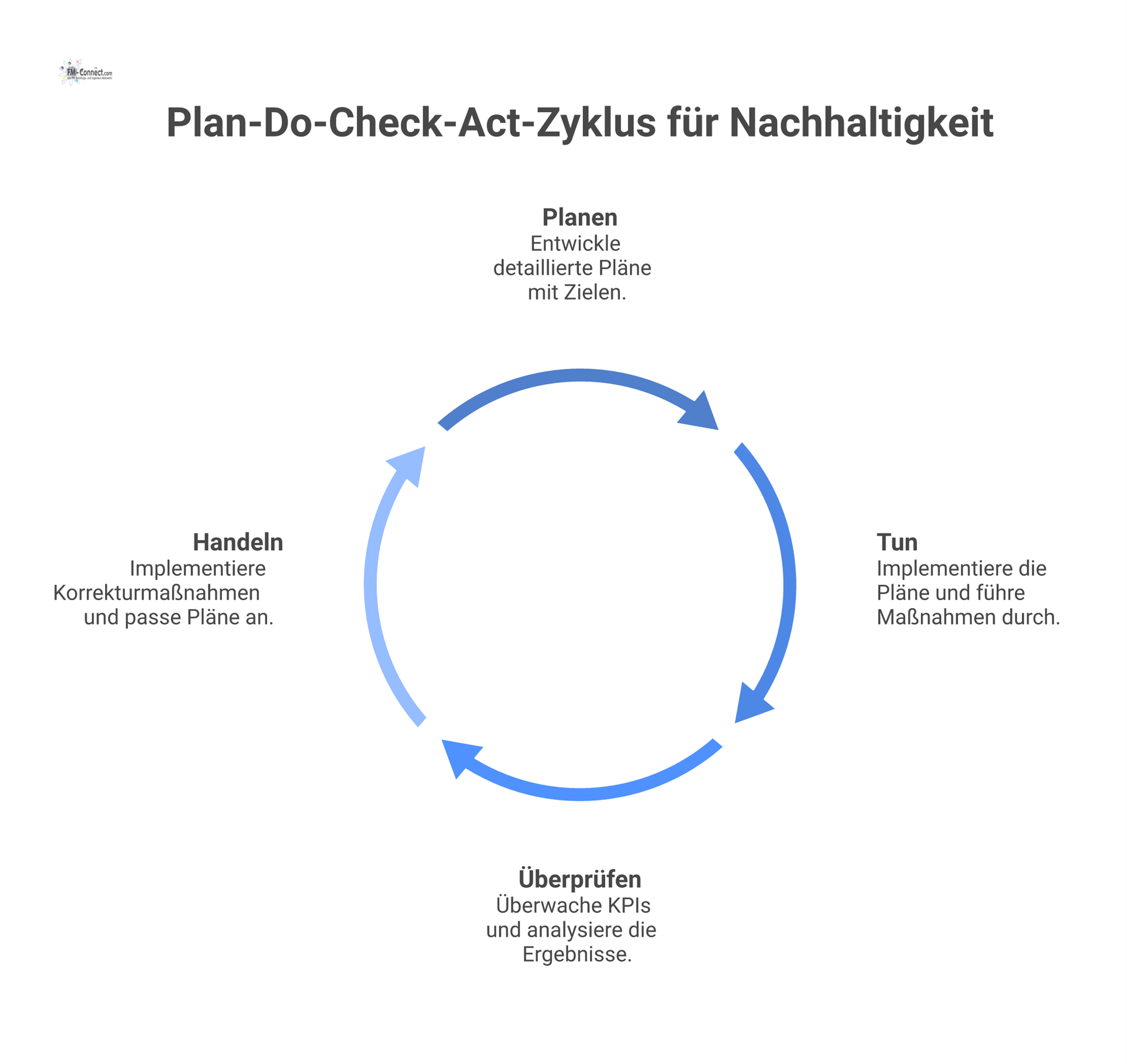 Durch diese klare Verfahrensstruktur – Planung, Umsetzung, Kontrolle und Nachsteuerung (Plan-Do-Check-Act-Zyklus) – wird sichergestellt, dass das Energie- und Nachhaltigkeitskonzept nicht nur auf dem Papier besteht, sondern aktiv gelebt und kontinuierlich verbessert wird.