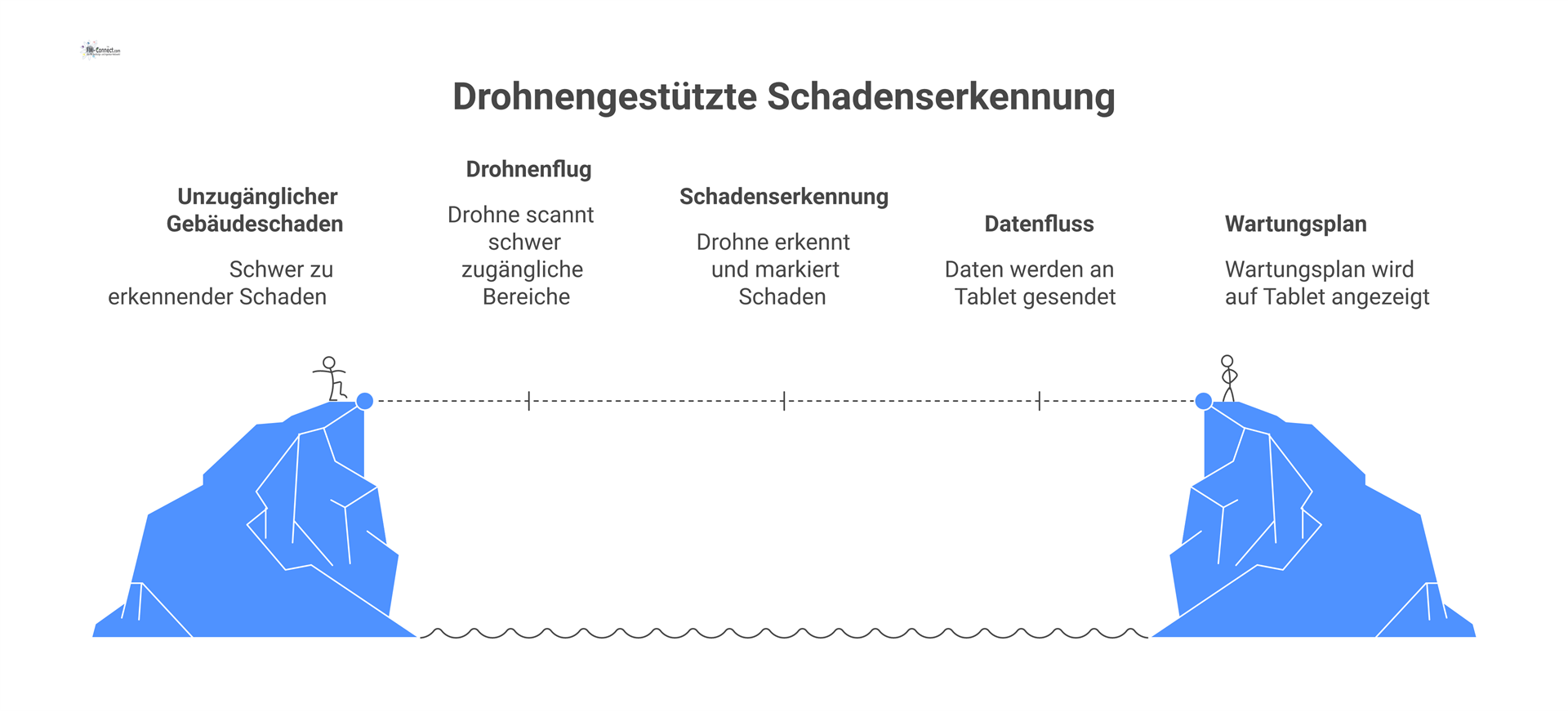 Verwendung von Drohnen zur Inspektion von schwer zugänglichen Bereichen wie Dächern und Fassaden, um Schäden frühzeitig zu erkennen und Wartungsarbeiten zu planen