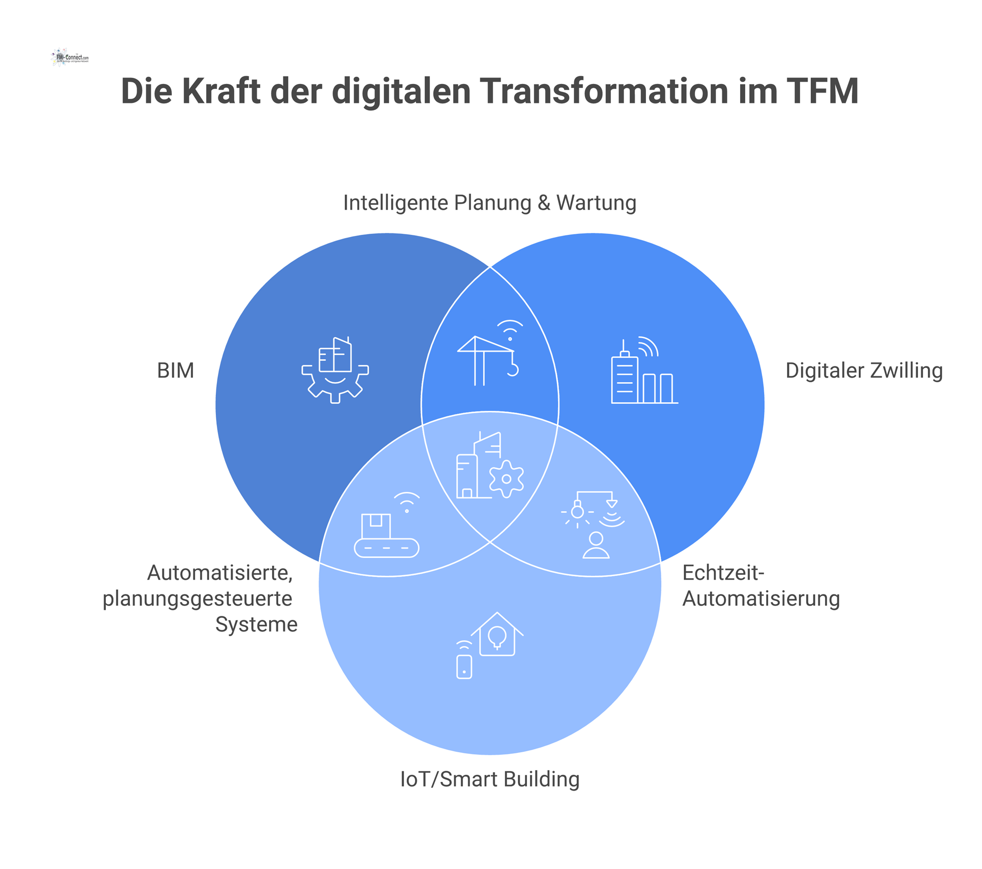 Die digitale Transformation revolutioniert das Technische Facility Management (TFM) und bringt erhebliche Verbesserungen in Effizienz und Effektivität. Durch den Einsatz von Building Information Modeling (BIM) können Planungs- und Bauprozesse präziser und kollaborativer gestaltet werden. BIM ermöglicht eine detaillierte 3D-Visualisierung und Modellierung von Gebäuden, was Fehler und Missverständnisse in der Planungsphase reduziert. Gleichzeitig erlauben digitale Zwillinge die Echtzeitüberwachung von Gebäudebetrieb und -zustand, was präventive Wartung und sofortige Problemerkennung ermöglicht. Smart Building-Technologien und das Internet der Dinge (IoT) spielen ebenfalls eine zentrale Rolle, indem sie Gebäudeautomation und Energieeffizienz optimieren. Sensoren und vernetzte Systeme sammeln kontinuierlich Daten, die zur Verbesserung der Betriebseffizienz und zur Reduktion der Betriebskosten genutzt werden können.