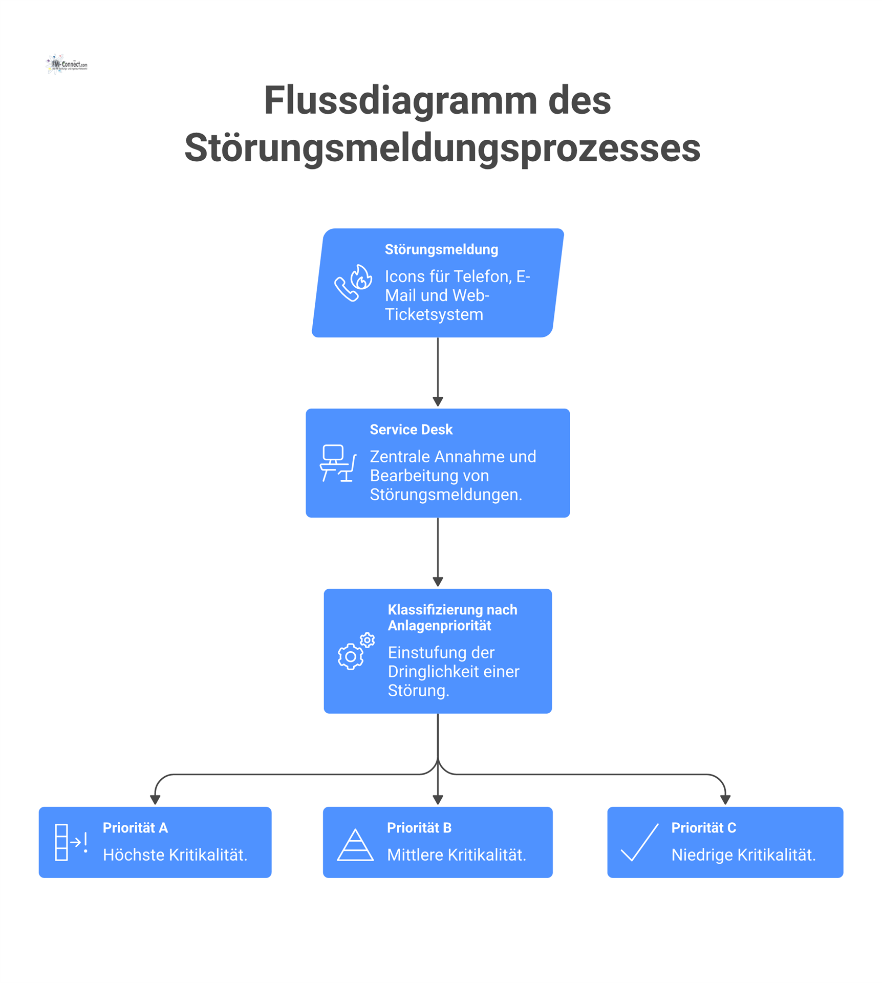 Der Service Desk ist die zentrale Anlaufstelle für alle technischen Anfragen und Störungsmeldungen. Anfragen können über verschiedene Kommunikationskanäle wie Telefon, E-Mail oder ein webbasiertes Ticketsystem eingereicht werden. Nach Eingang einer Anfrage wird diese zunächst von einem Service Desk-Mitarbeiter entgegengenommen und klassifiziert. Eine sorgfältige Bewertung der Dringlichkeit und der Art des Problems erfolgt unter Berücksichtigung der Priorität der betroffenen Anlage.