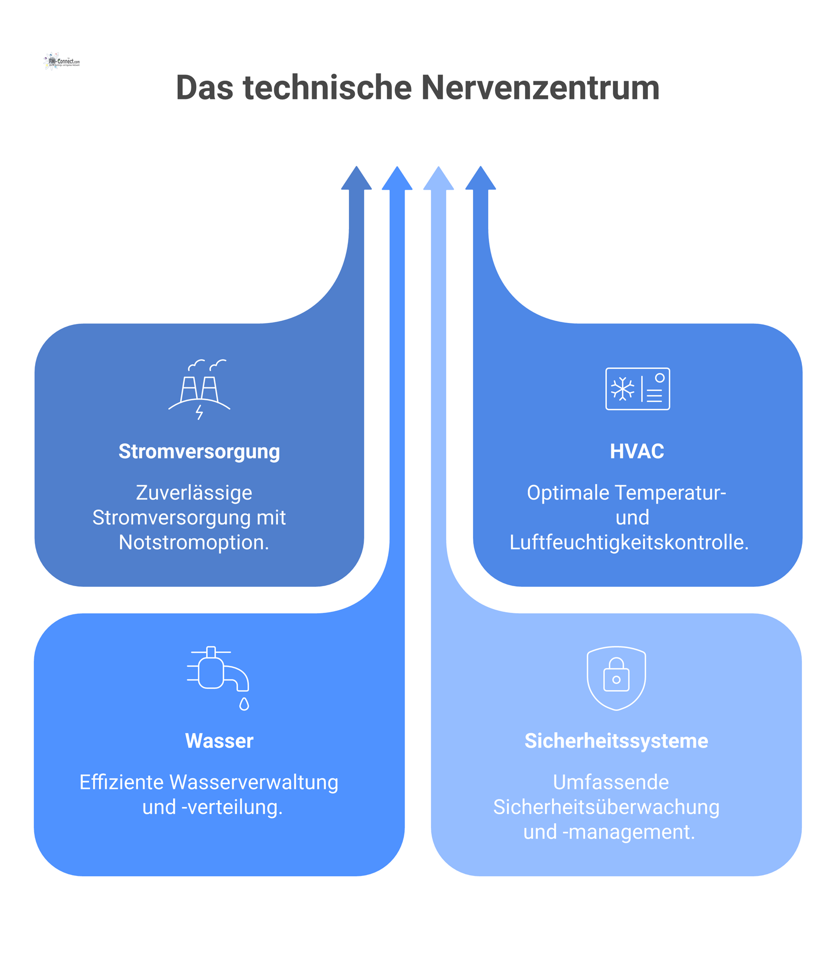 | Elektrotechnische Anlagen | Energieverteilung, Notstromaggregate, USV-Anlagen | Sichern die kontinuierliche Stromversorgung auch bei Netzstörungen |