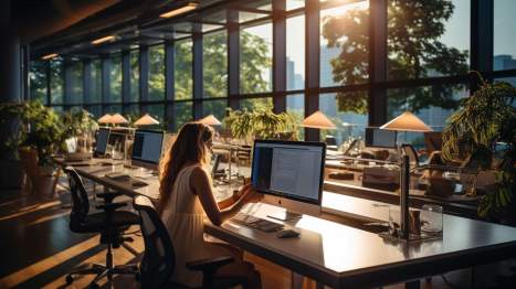 Modernes Büro mit natürlichem Licht, ergonomischen Arbeitsplätzen und nachhaltigem Design.