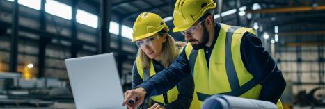 Fachkräfte analysieren Daten am Laptop im Werk.