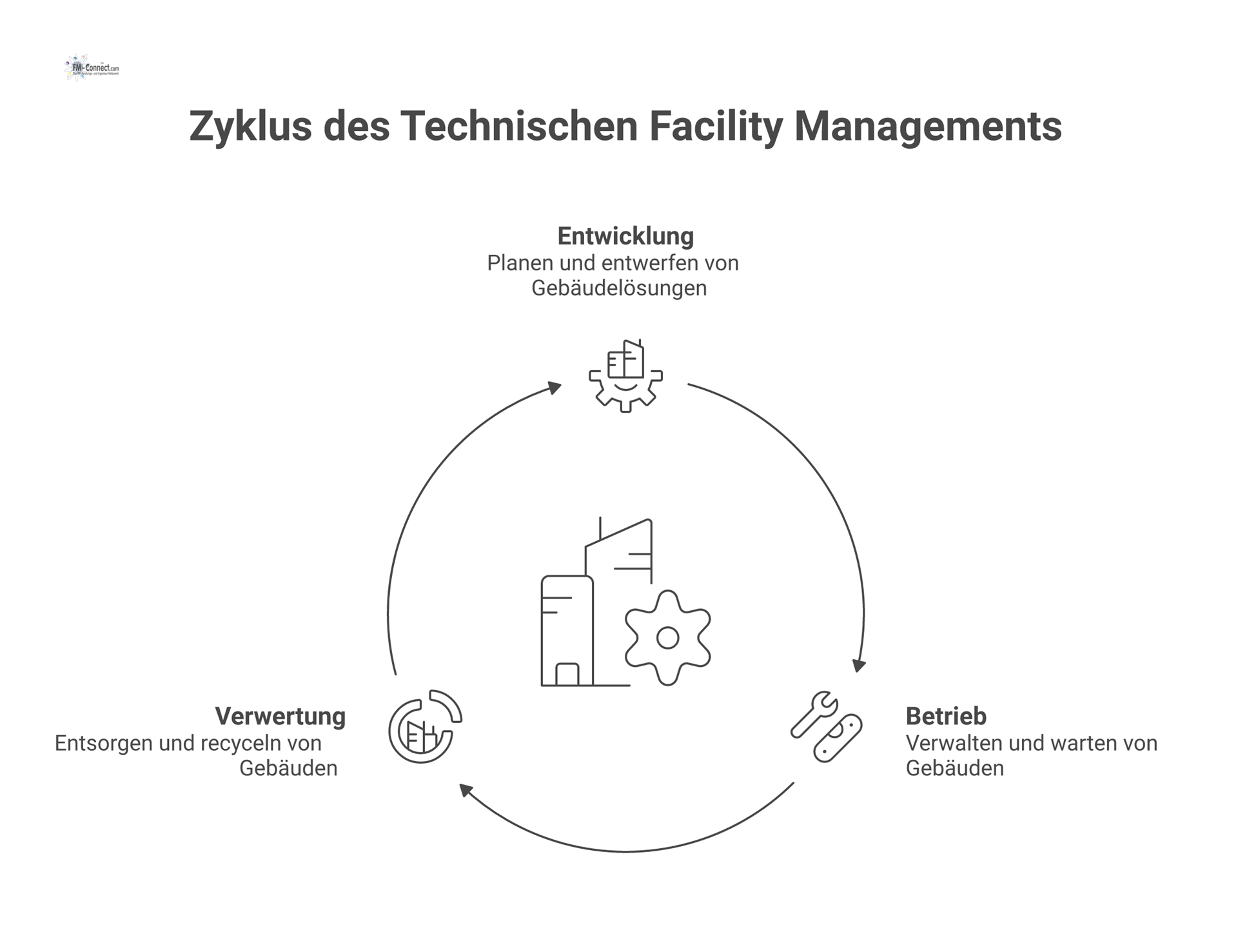 Visualisierung der Schlüsselphasen: Entwicklung, Betrieb und Verwertung im Facility Management.