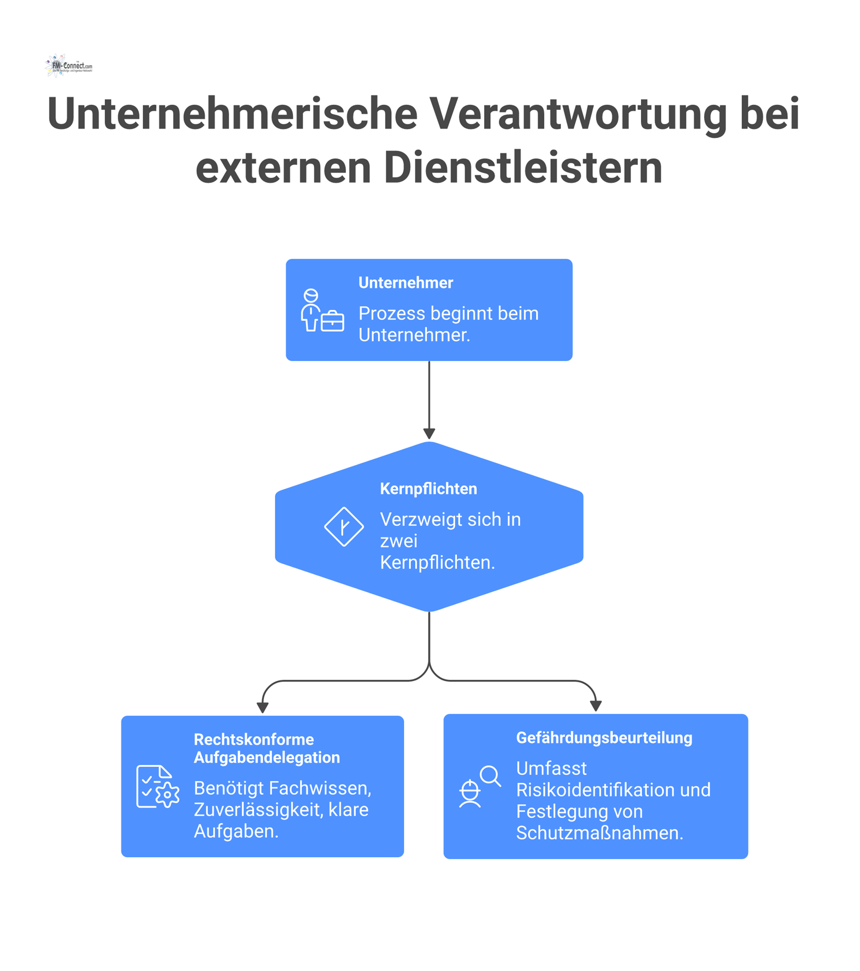 Bei der Beauftragung externer Unternehmen ist es für jeden Unternehmer unerlässlich, eindeutige Regelungen zur Nutzung dieser Dienstleister zu etablieren. Diese Notwendigkeit leitet sich aus § 8 des Arbeitsschutzgesetzes (ArbSchG) und § 5 BGV A 1 ab, die die Sicherstellung der Arbeitssicherheit bei der Kooperation mit mehreren Arbeitgebern innerhalb des Unternehmens regeln.