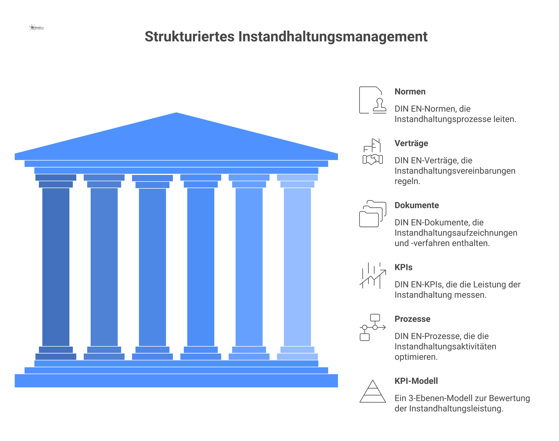 DIN EN 17007 beschreibt generisch den Instandhaltungsprozess und die Charakteristika der Prozessbestandteile; dazu werden Indikatoren als Leitplanken der Steuerung adressiert. DIN EN 16646 ordnet Instandhaltung in den Kontext des Anlagenmanagements ein.
