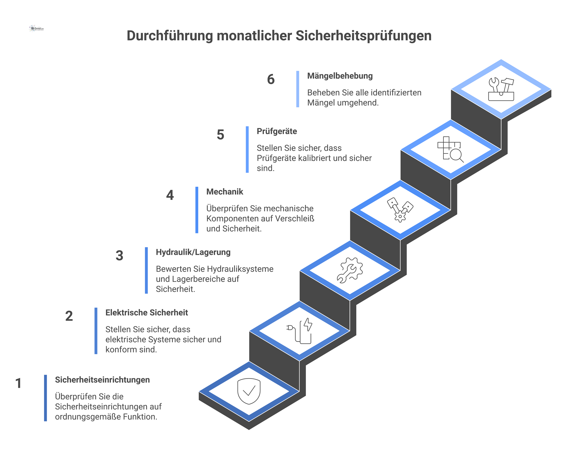 Mängelmanagement: Festgestellte Mängel (z. B. verschlissene Zahnradgetriebe, beschädigte Schutzabdeckungen) sind sofort im Mängelsystem zu erfassen. Kritische Mängel (Absturzgefahr, Funktionsausfall der Schutzvorrichtung) führen zur sofortigen Stillsetzung des Geräts und Melden an die Geschäftsführung. Die Beseitigung wird bis zur nächsten Prüffrist dokumentiert.