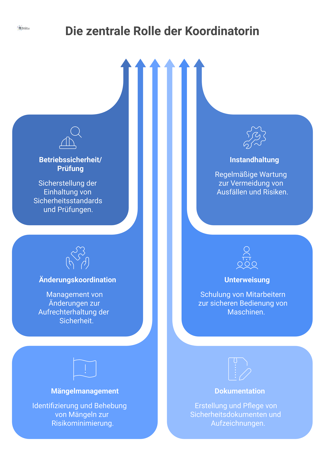 Zusammenarbeit: Die Koordinatorin stimmt sich mit Fremdfirmen (z. B. Instandhalter, Lieferanten) ab und überwacht deren Arbeitsweise. Für Dritte gelten dieselben Sicherheitsregeln wie für eigenes Personal. Sie arbeitet auch mit Brandschutz (z. B. Heizungsanlagen-Monitoring) und Arbeitsschutz (Träger von PSA, Lärm-, Chemikalien-) zusammen.