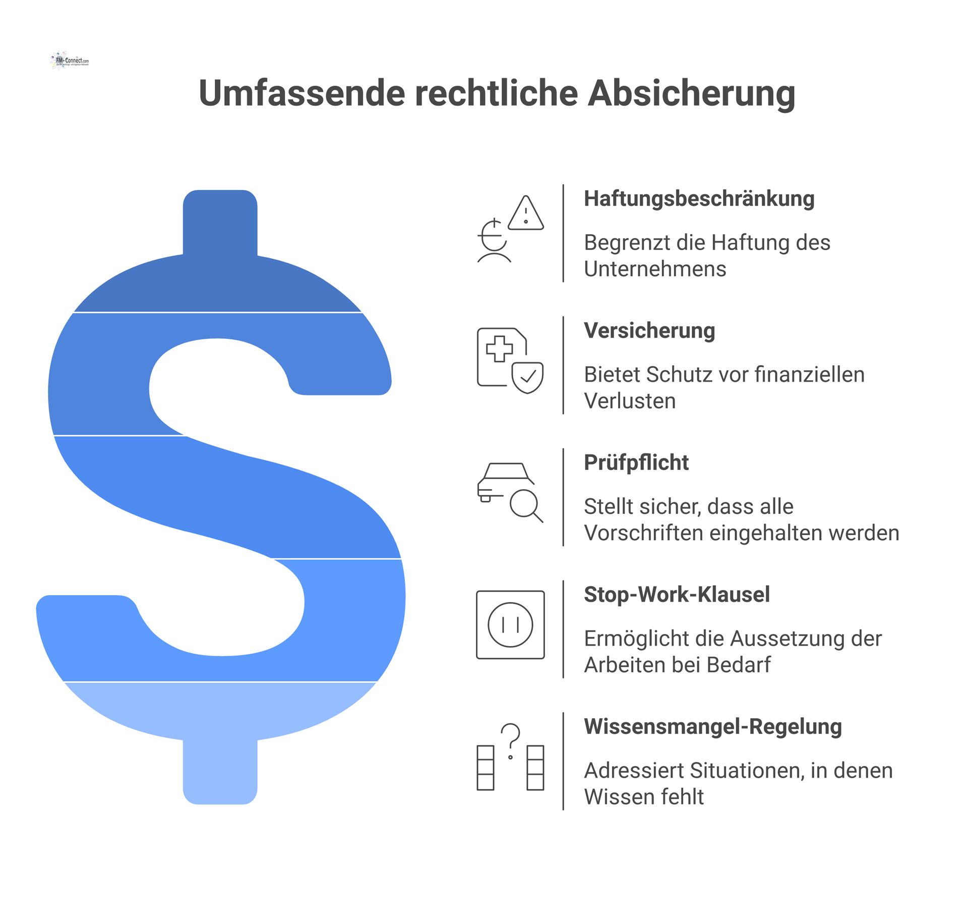 Stop-Work-Klausel: Klare Regel, dass Arbeiten bei sicherheitsrelevanten Problemen sofort eingestellt werden und erst nach Freigabe fortgesetzt werden dürfen (analog Haltelinien in Wartungsverträgen).