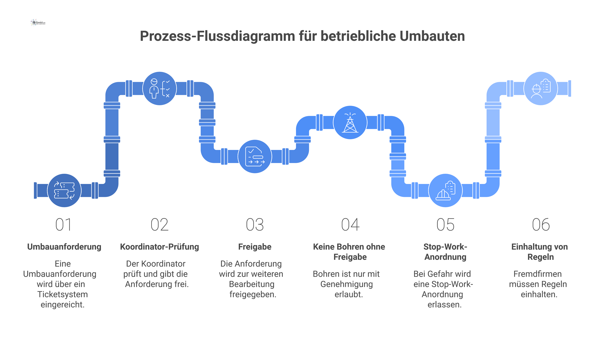 Koordinieren von Instandhaltungs-/Umbauarbeiten unter Berücksichtigung arbeitsorganisatorischer Besonderheiten (Termindruck, Arbeiten im laufenden Betrieb, unbekannte Strukturen) und Abstimmen von Schutzmaßnahmen bei Zusammenarbeit mehrerer Bereiche/Arbeitgeber.