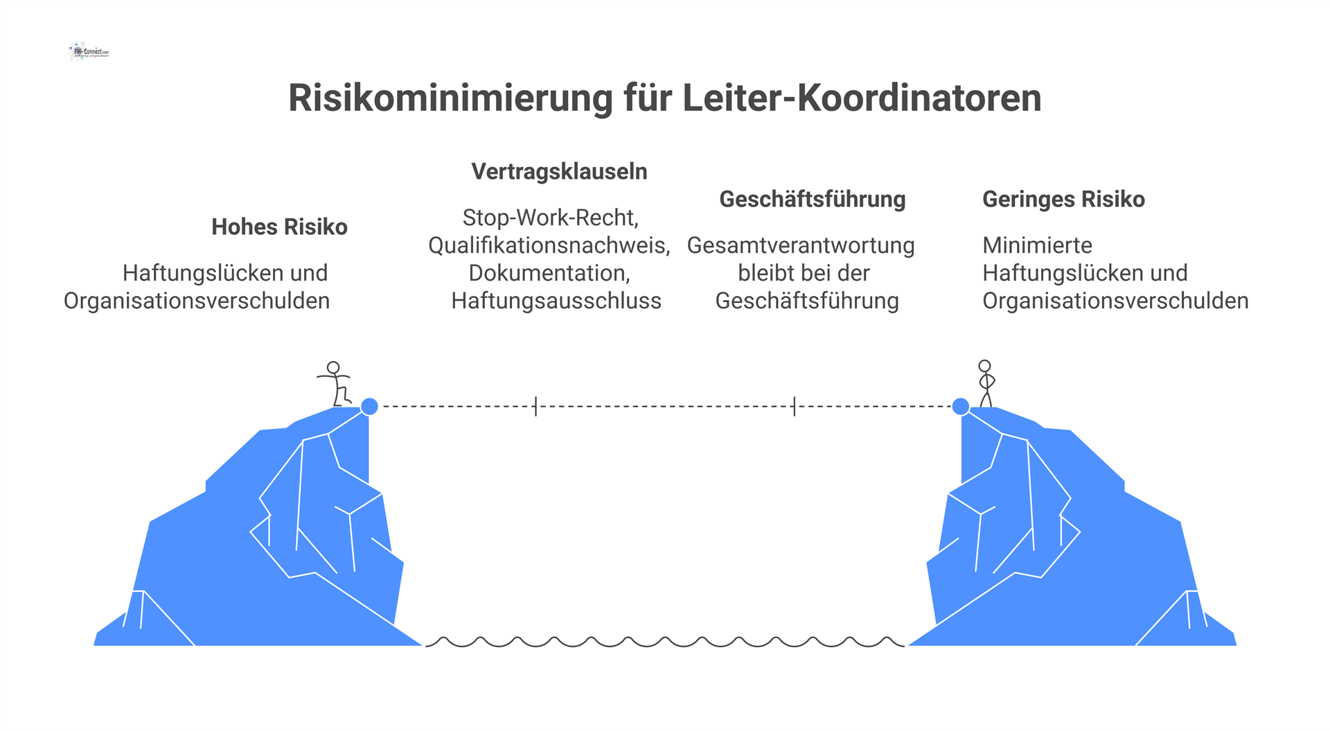 Haftungsausschluss: Im Vertrag festhalten, dass der Leiter-Koordinator nur Organisationsbeauftragter ist; die Gesamtverantwortung bei der Geschäftsführung verbleibt.