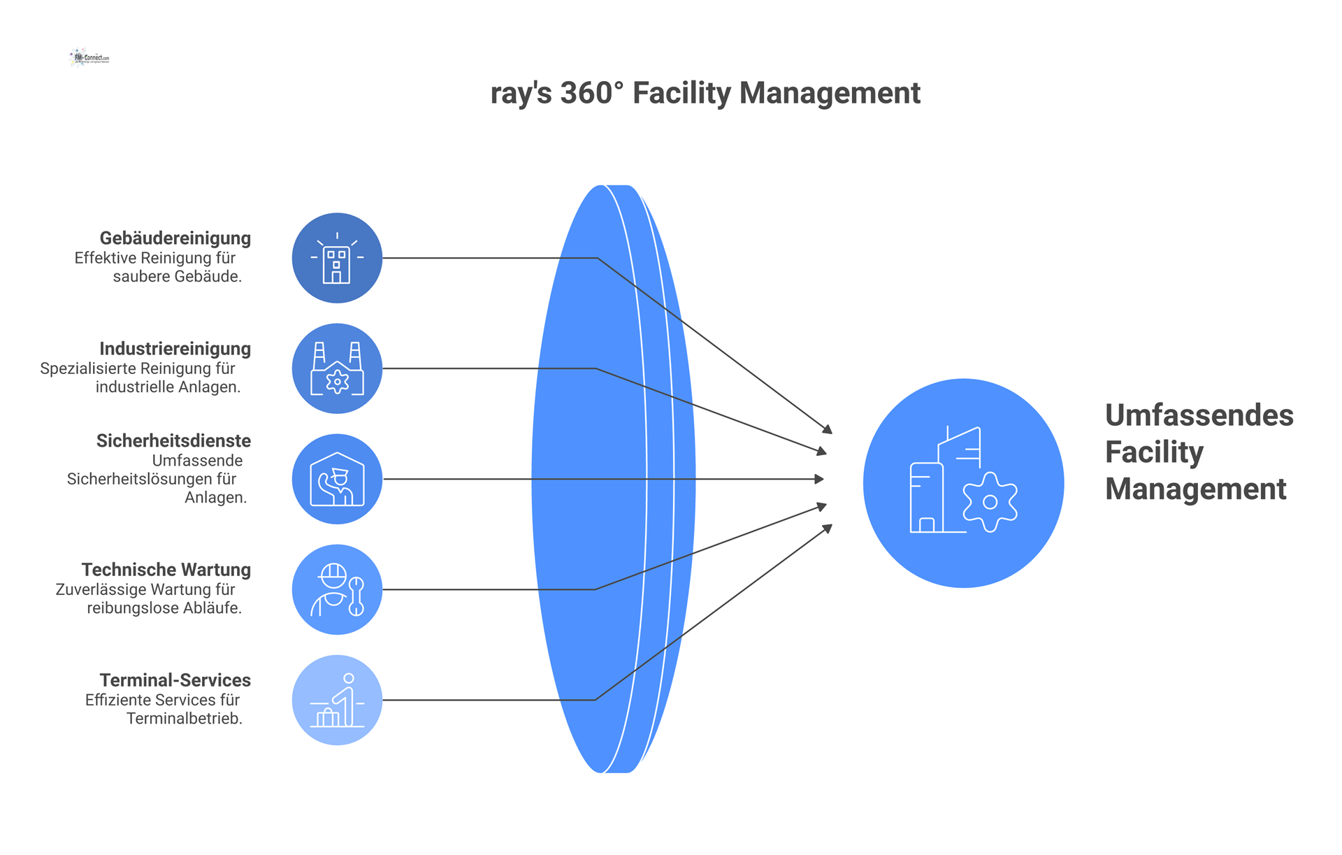 Die ray facility management group – Nils Bogdol GmbH (Markenname ray) ist ein mittelständischer Komplettanbieter für Facility Management mit Fokus auf ganzheitliche 360°-Konzepte. Das Unternehmen mit Sitz in Holdorf (Niedersachsen) bietet alle klassischen FM-Dienstleistungen an und positioniert sich als „Vordenker und Jetzt-Macher“ im Gebäudemanagement. Zu den Kompetenzfeldern von ray gehören insbesondere Gebäudereinigung (Innen- und Außenreinigung, Glasreinigung), Industriereinigung (Reinigung von Maschinen, Produktionsumgebungen), Sicherheitsdienstleistungen (Objektschutz, Werksicherheit, Empfangsdienste) sowie technische Wartung und Gebäudetechnik. Ray übernimmt die Instandhaltung der Gebäudetechnik (z.B. regelmäßige Wartungen von Heizungs-, Lüftungs-, Brandschutzanlagen), das Wartungsmanagement (inkl. Planen von Prüfterminen) und bietet Hausmeisterservices für tägliche technische Betreuung. Im kaufmännischen Gebäudemanagement unterstützt ray bei Nebenkostenabrechnungen, Vertragsverwaltung und Objektcontrolling. Auch Terminal-Services (Post- und Paketdienste, Konferenzraum-Management) gehören zum Portfolio, was zeigt, dass ray über das klassische FM hinaus auch Dienstleistungen für Nutzer erbringt. Das Alleinstellungsmerkmal der ray-Gruppe ist der ganzheitliche Ansatz: Man versteht FM nicht nur als Summe von Einzelleistungen, sondern betrachtet ein Gebäude umfassend – von Sauberkeit über technische Verfügbarkeit bis Nutzerzufriedenheit – und möchte mit Innovation, Nachhaltigkeit und Diversität im Team bessere Ergebnisse erzielen.