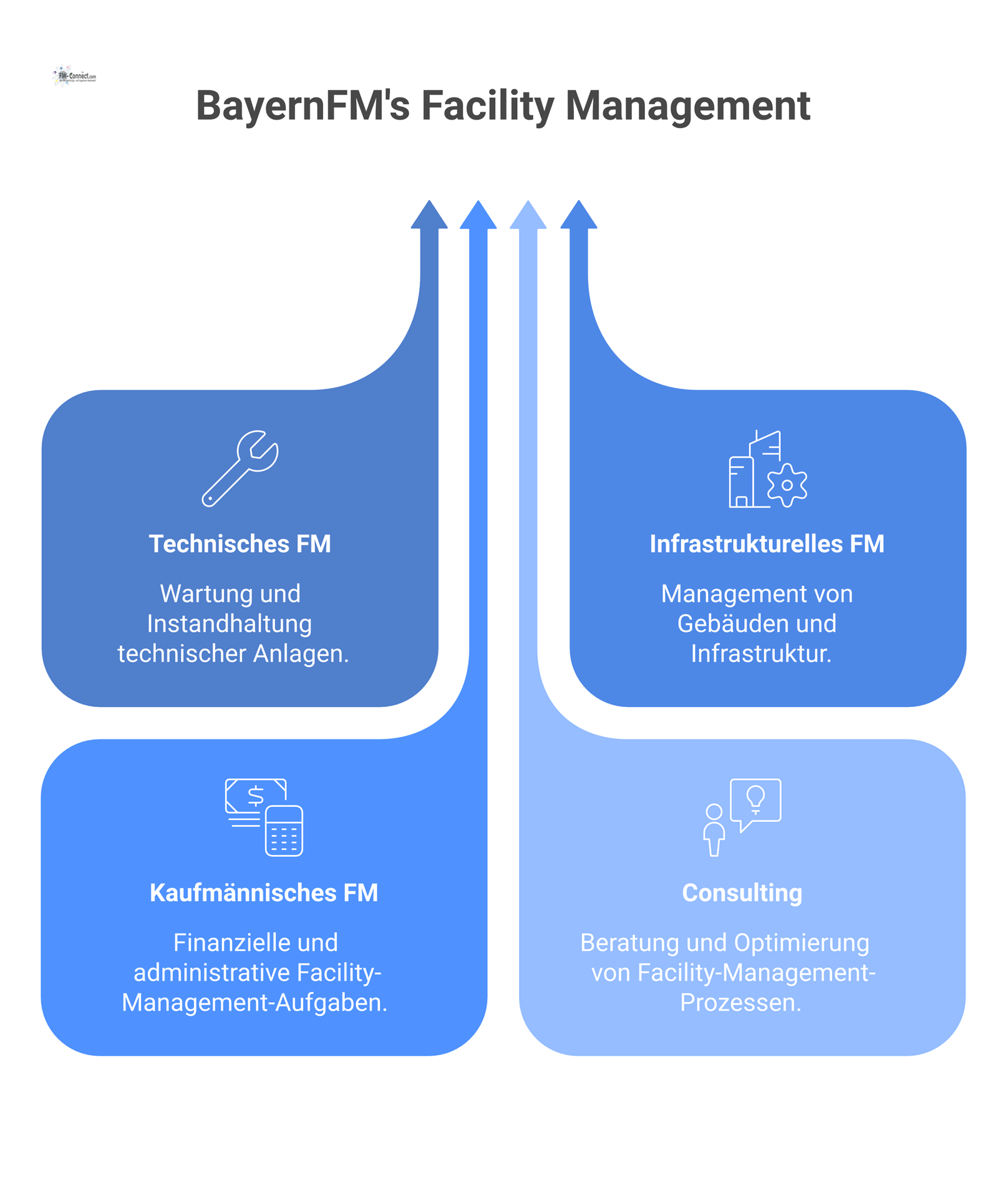 Die Bayern Facility Management GmbH (BayernFM) bietet ein breites integriertes Facility-Management-Portfolio mit Schwerpunkten im technischen Gebäudemanagement. Dazu zählen Betriebsführung und Instandhaltung von Gebäude- und Anlagentechnik, Energieoptimierung (Energiemanagement) sowie Beratung zu Betreiberpflichten und -risiken. Ergänzend erbringt BayernFM infrastrukturelle FM-Leistungen (z.B. Gebäudereinigung, Hausmeisterdienste und Sicherheitsdienste über Partner) und kaufmännisches Objektmanagement (wie Mietvertragsmanagement oder Flächenmanagement) in integrierten Servicekonzepten. Als FM-Consultant unterstützt BayernFM zudem bei der Optimierung von Immobilienportfolios und Bauprojekten.